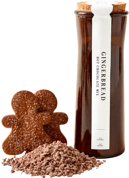 This holiday-edition Gingerbread Hot Chocolate Mix combines the subtly fruity 70% Costa Esmeraldas, Ecuador chocolate with warm, celebratory hints of cinnamon, ginger, nutmeg, and clove, plus a pinch of organic cane sugar, for smooth, caramelly richness.