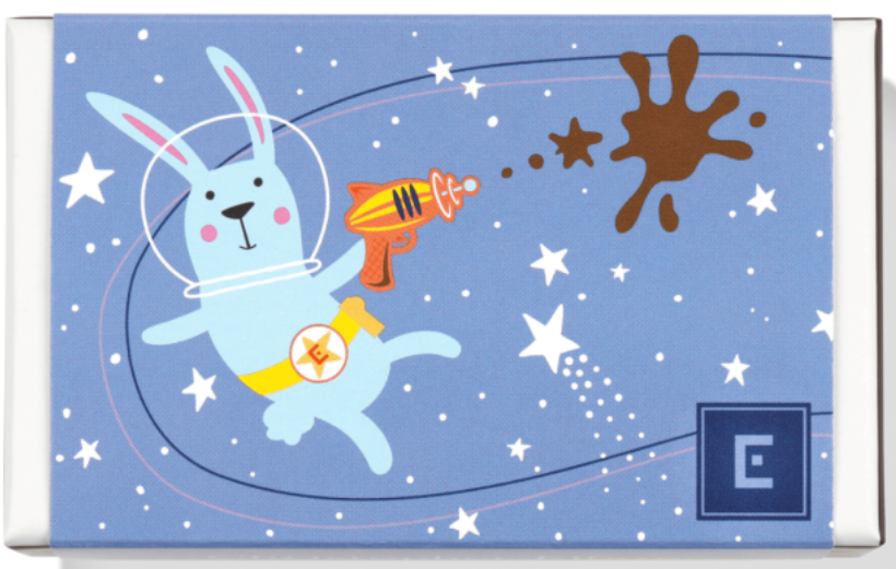 These two bonbons are a stellar fusion of rich dark chocolate and our signature salted caramel. Features Commander Warren Starbuck, our fearless astronaut bunny, in space with his 1950's science fiction-inspired chocolate ray gun.